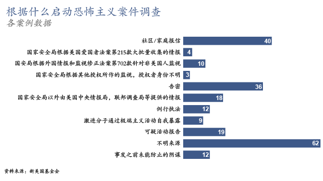 新美国基金会说,美国国家安全局的监听项目有可能在其它调查中起过作用,可是大约60%的侦查来自传统的调查方法,比如从家庭成员或者线人那里得到举报线索,或者有人报告可疑活动。